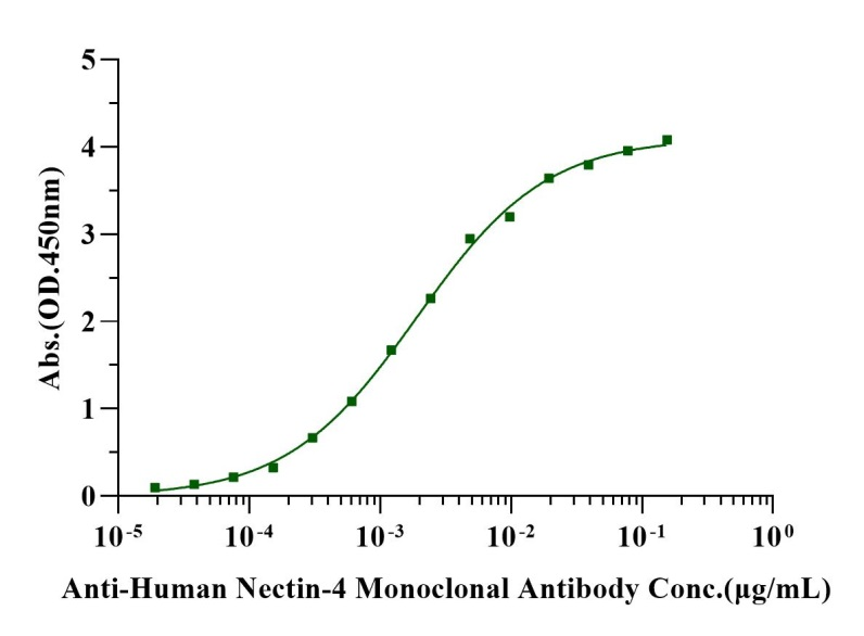 Immobilized Nectin-4 His Tag, Human (Cat. No. UA010020) at 2μg/mL (100μL/well) can bind Anti-Human Nectin-4 Monoclonal Antibody with EC50 of 1.70-2.16 ng/ml.