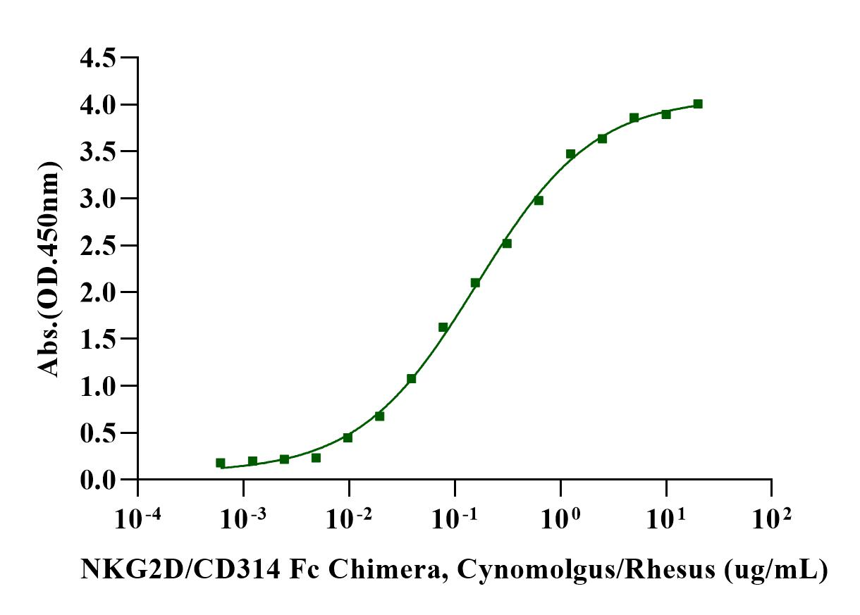 Immobilized MICB His Tag, Human (Cat. No. UA010590) at 2.0μg/mL (100μL/well) can bind NKG2D/CD314 Fc Chimera, Cynomolgus/Rhesus (Cat. No. UA010739) with EC50 of 0.14-0.18 μg/mL.