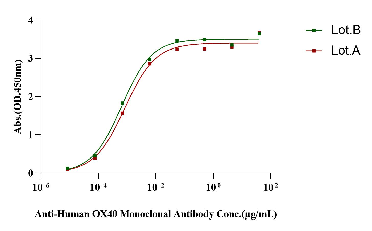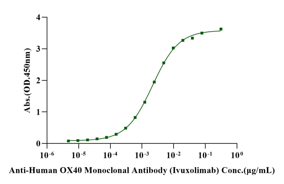 Immobilized OX40/TNFRSF4 His Tag, Human (Cat. No. UA010153) at 2.0μg/mL (100μL/well) can bind Anti-Human OX40 Monoclonal Antibody (Ivuxolimab) with EC50 of 2.03-2.29 ng/mL.