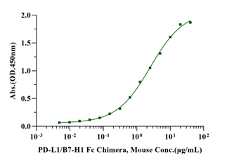 Immobilized PD-1 His Tag, Mouse (Cat. No. UA010292) at 2.0μg/mL (100μL/well) can bind PD-L1/B7-H1 Fc Chimera, Mouse (Cat. No. UA010259) with EC50 of 2.18-3.03μg/ml.