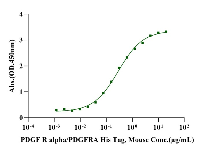 Immobilized PDGF-AA, Mouse (Cat. No. UA040104) at 2μg/mL (100μL/well) can bind PDGF R alpha/PDGFRA His Tag, Mouse (Cat. No. UA010714) with EC50 of 0.25-0.34μg/ml.