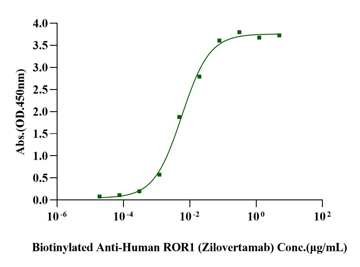 Immobilized ROR1 Fc Chimera Protein, Human (Cat. No. UA010271) at 2.0μg/mL (100μL/well) can bind Biotinylated Anti-Human ROR1 (Zilovertamab) with EC50 of 4.38-7.57ng/mL.