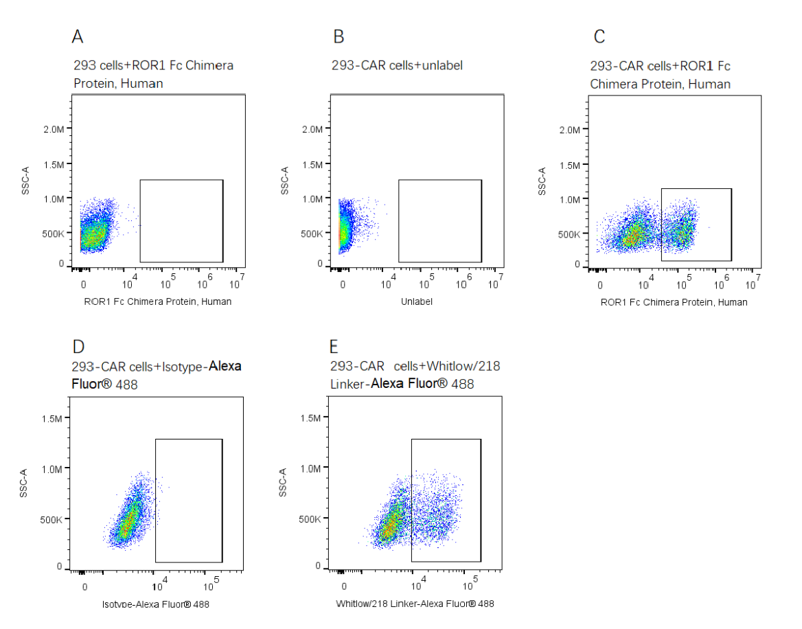 2e5 of transient transfected anti-ROR1 ScFv CAR-293 cells were stained with 0.01ug ROR1 Fc Chimera Protein, Human, (Cat. No. UA010271) and unlable respectively (Fig. C and B), and non-transfected 293 cells were used as a control (Fig. A). Alexa Fluor 647 signal was used to evaluate the binding activity. 2e5 of transient transfected anti- ROR1 ScFv CAR-293 cells were stained with isotype and Whitlow/218 Linker-Alexa Fluor® 488 (Fig. D and E). Alexa Fluor® 488 signal was used to evaluate the binding activity.