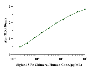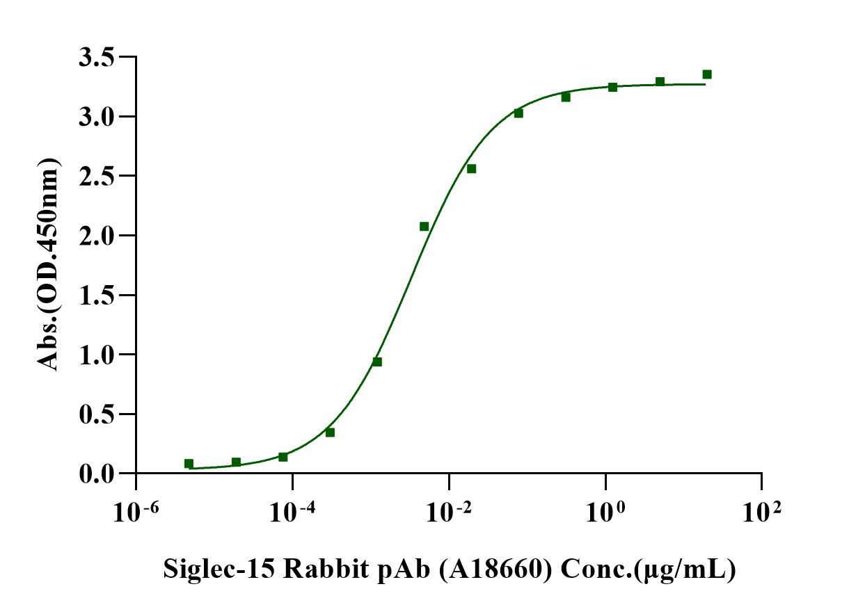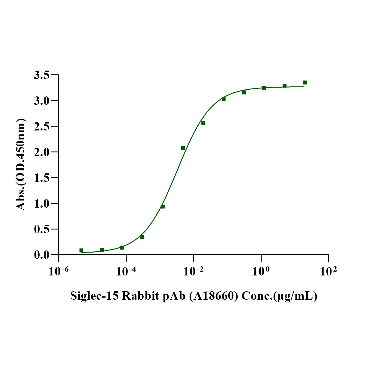 Immobilized Siglec-15 Fc Chimera Protein, Human (Cat. No. UA010059) at 2.0μg/mL (100μL/well) can bind Siglec-15 Rabbit pAb (A18660)  with EC50 of 2.57-4.33 ng/mL.