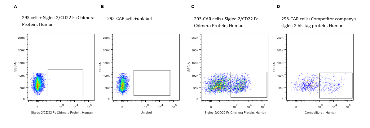 2e5 of transient transfected anti-Siglec-2 ScFv CAR-293 cells were stained with 0.1ug Siglec-2/CD22 Fc Chimera Protein, Human, (Cat. No. UA010025) and unlabel respectively (Fig. C and B), and non-transfected 293 cells were used as a control (Fig. A). Alexa Fluor® 647 signal was used to evaluate the binding activity.