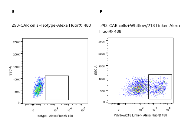 2e5 of transient transfected anti-Siglec-2 ScFv CAR-293 cells were stained with isotype and Whitlow/218 Linker-Alexa Fluor® 488 (Fig. E and F). Alexa Fluor® 488 signal was used to evaluate the binding activity.