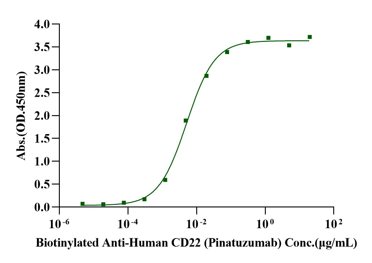 Immobilized Siglec-2/CD22 Fc Chimera, Human (Cat. No. UA010025) at 2.0μg/mL (100μL/well) can bind Biotinylated Anti-Human CD22 (Pinatuzumab) with EC50 of 4.32-6.15ng/mL.
