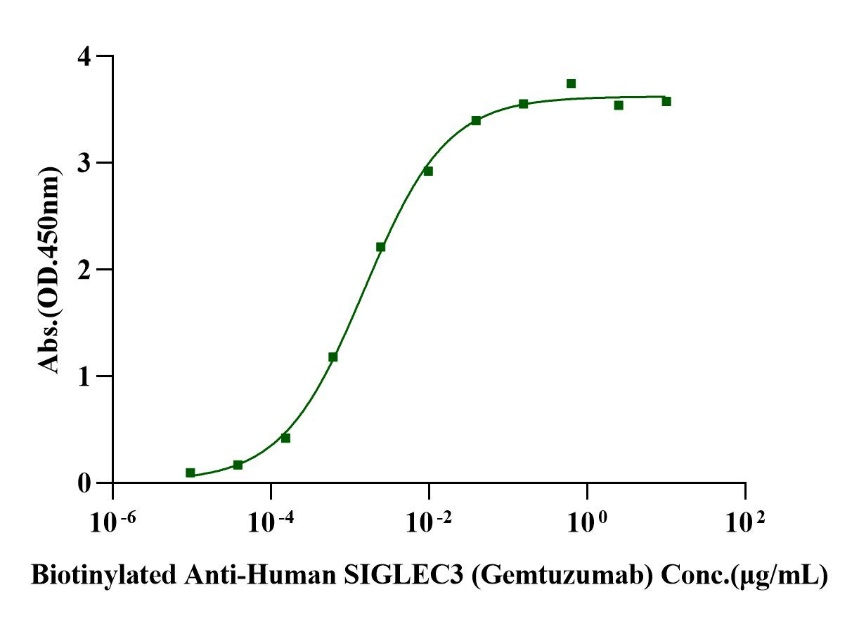 Immobilized Siglec-3/CD33 Fc Chimera Protein, Human  (Cat. No. UA010026) at 2.0μg/mL (100μL/well) can bind Biotinylated Anti-Human SIGLEC3 (Gemtuzumab)  with EC50 of 1.21-1.91ng/mL.
