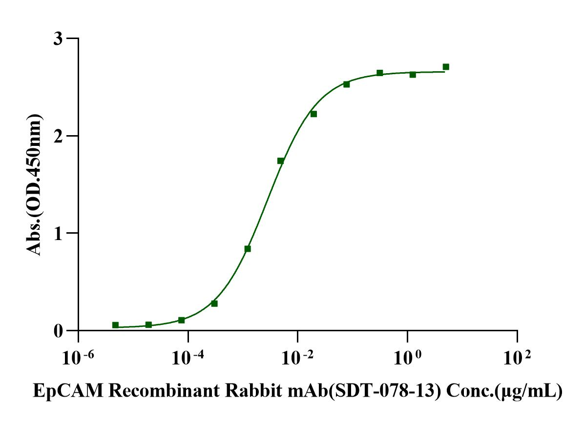 Immobilized TROP1/EpCAM His Tag, Human (Cat. No. UA010236) at 2.0μg/mL (100μL/well) can bind EpCAM Recombinant Rabbit mAb(SDT-078-13) (Cat. No. S0B2028) with EC50 of 2.39-3.33ng/mL.