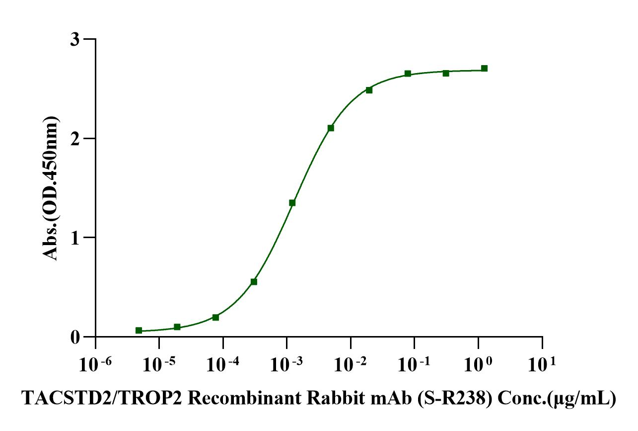 Immobilized TROP2 Fc Chimera Protein, Human (Cat. No. UA010230) at 2.0μg/mL (100μL/well) can bind TACSTD2/TROP2 Recombinant Rabbit mAb (S-R238) (Cat. No. S0B0324) with EC50 of 1.20-1.40ng/mL.
