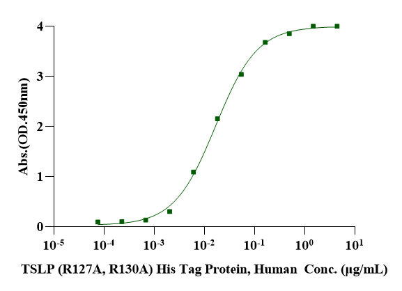 Immobilized TSLP (R127A, R130A) His Tag Protein, Human (Cat. No. UA040105) at 2.0μg/mL (100μL/well) can bind TSLPR Fc Chimera Protein, Human (Cat. No. UA010907) with EC50 of 1.39-2.35ng/mL.