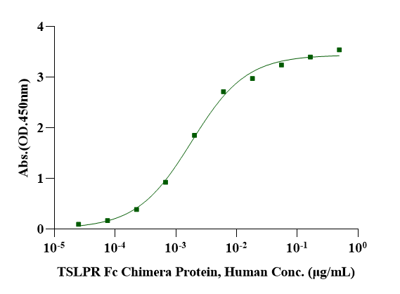 Immobilized TSLP, Human (Cat. No. UA040102) at 2.0μg/mL (100μL/well) can bind TSLPR Fc Chimera Protein, Human (Cat. No. UA010907) with EC50 of 0.83-1.33ng/mL.