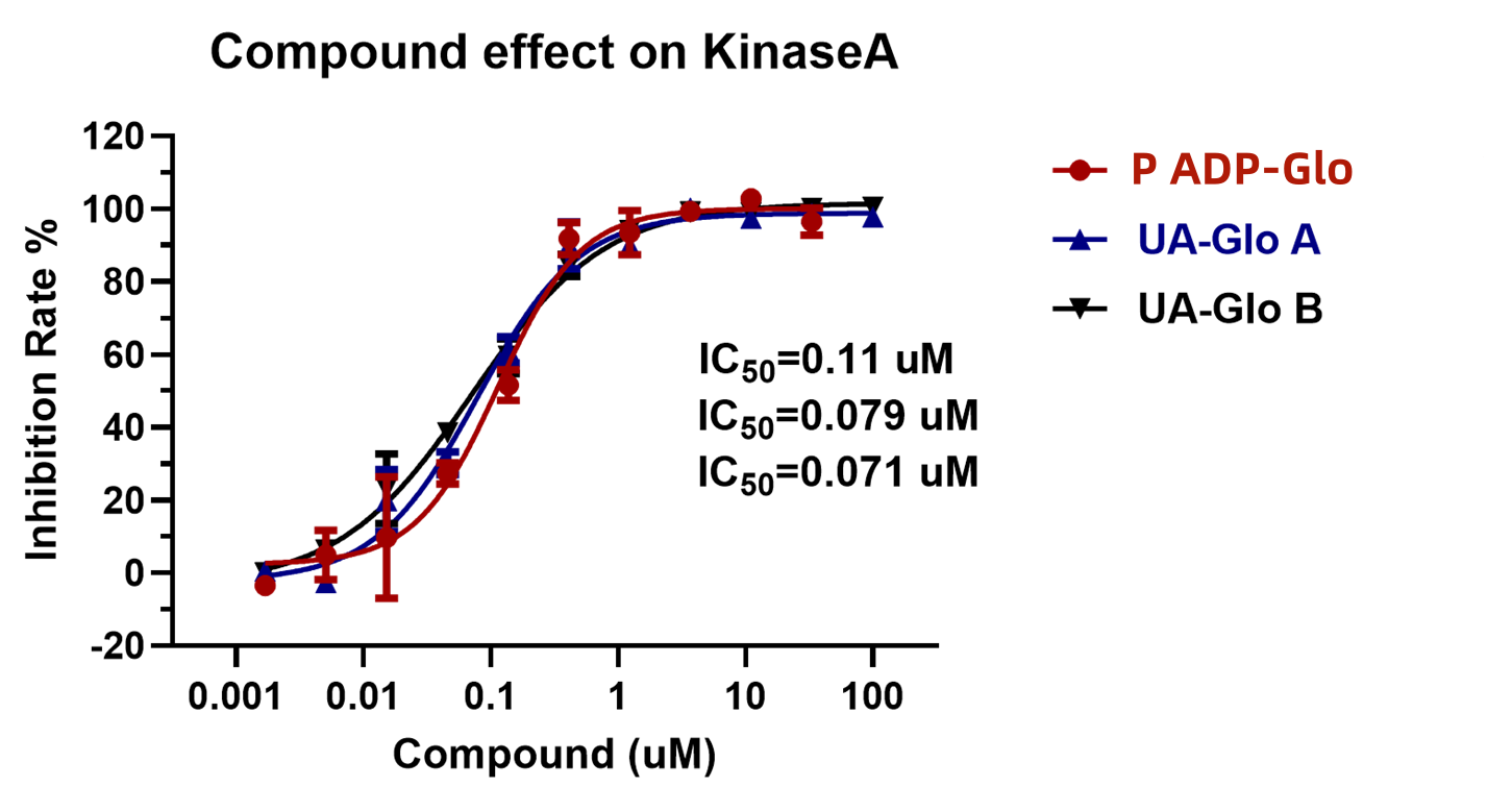 2) 激酶反应的激酶和底物浓度需要根据不同的激酶进行优化。在实验所需的适当信噪比的情况下,可以采用在信号线性反应范围的激酶浓度进行实验。由于UA-Glo ADP激酶检测试剂盒的高度灵敏性,激酶用量可以极大降低。