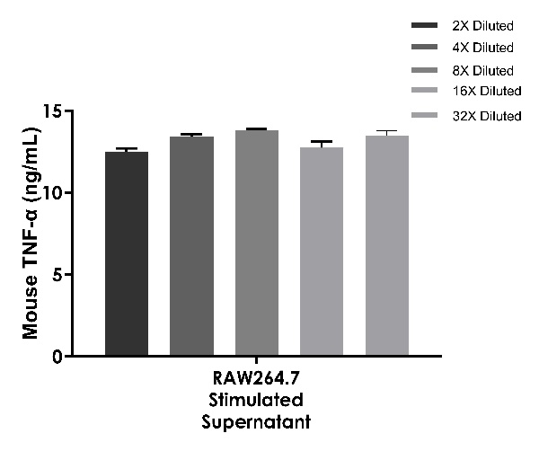 Sample is undiluted samples are as follows: RAW264.7 mouse monocyte/macrophage cells stimulated with 5ug/ml LPS and 100ng/mL rmIL-10 for 7days (100%). The interpolated dilution factor corrected values are plotted. The mean target concentration was determined to be 13.19 ng/mL in stimulated RAW264.7 supernatant.
