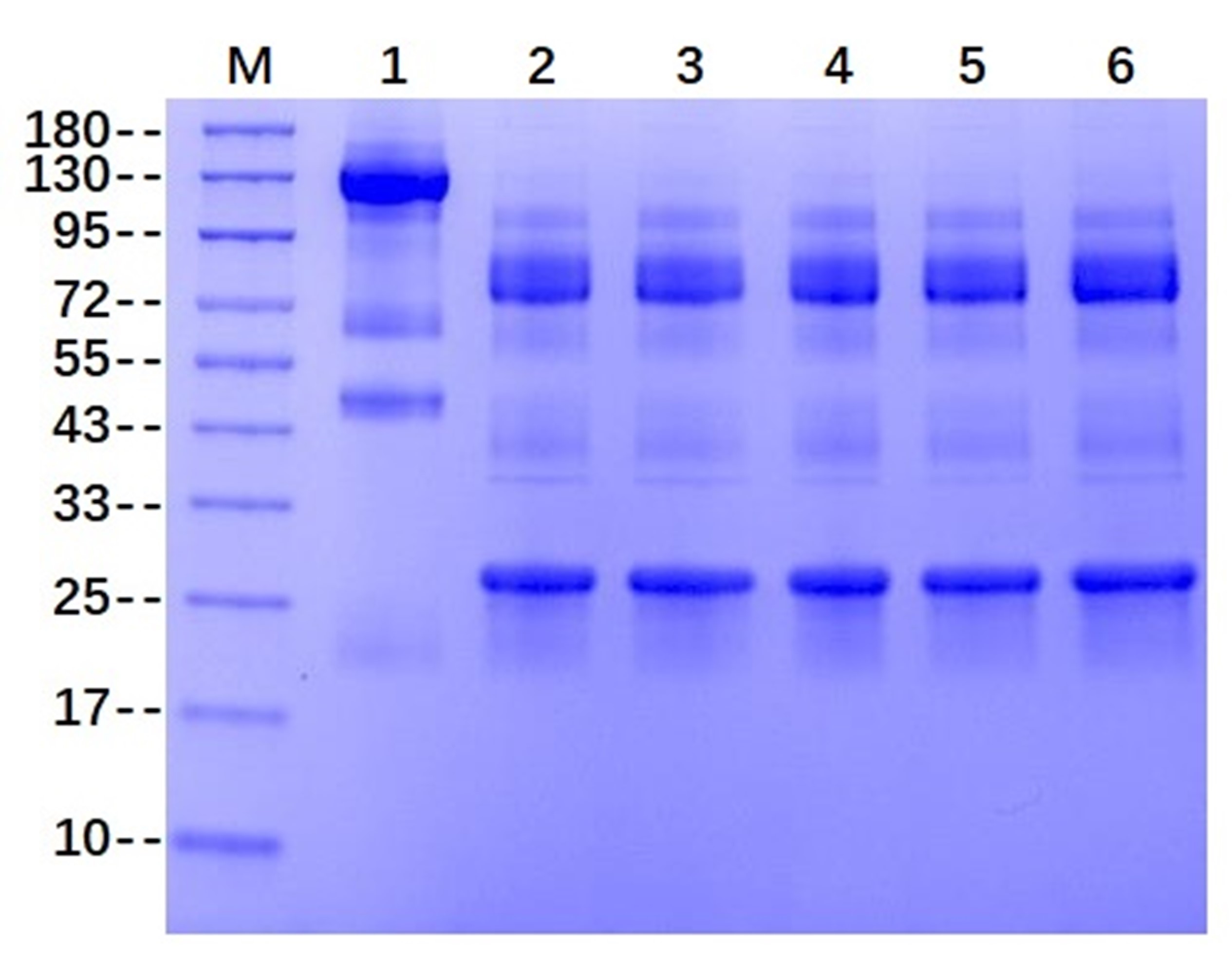 M: marker ; Complement IdeS protease,2μg on SDS-PAGE under Non-reducing and reducing condition . The purity is greater than 95%.