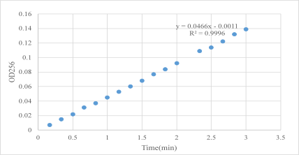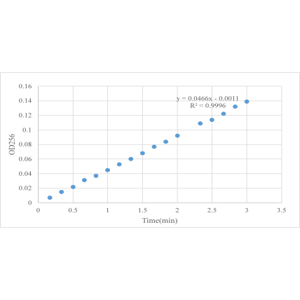 In the experimental design, BTEE substrate was prepared, and 6 ul α-chymotrypsin of 0.2 mg/mL was added to the uartz cuvette with an optical path of 1cm of 2994 ul substrate and the absorption value of 256 nm was read every 10 seconds at 25 ℃.