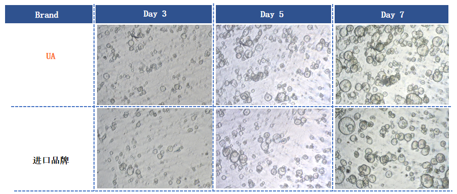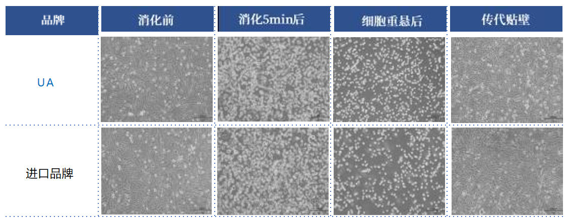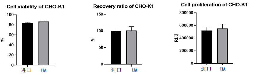 Normal CHO-K1 cells were digested with imported brand pancreatic enzyme analogue (1×) and UA brand 0.025mg/ml recombinant pancreatic enzyme LS, respectively. ① Cell viability was calculated after digestion at 37℃ for 5min. ② After the cells were digested by pancreatic enzyme, the cell yield was calculated by using pancreatic enzyme digestion. ③ The digested cells were inoculated into 96-well plates and cultured to a certain density to detect cell proliferation activity.