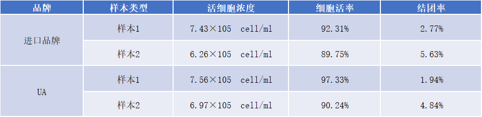 The normal cultured mesenchymal stem cells were digested with imported brand (1×) and recombinant trypsin LS, respectively, and the live cell concentration, cell viability and clumping rate were calculated.