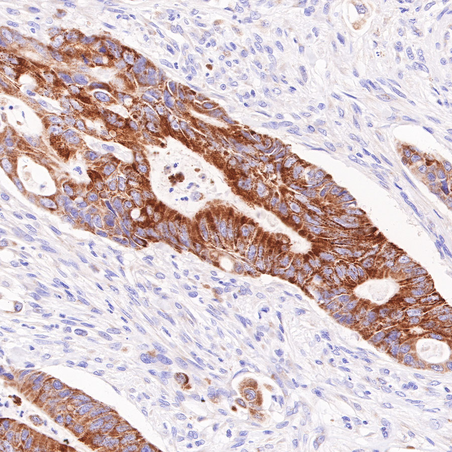 IHC shows positive staining in paraffin-embedded human pancreatic carcinoma. Anti-AMACR antibody was used at 1/1000 dilution, followed by a HRP Polymer for Mouse & Rabbit IgG (ready to use). Counterstained with hematoxylin. Heat mediated antigen retrieval with Tris/EDTA buffer pH9.0 was performed before commencing with IHC staining protocol.