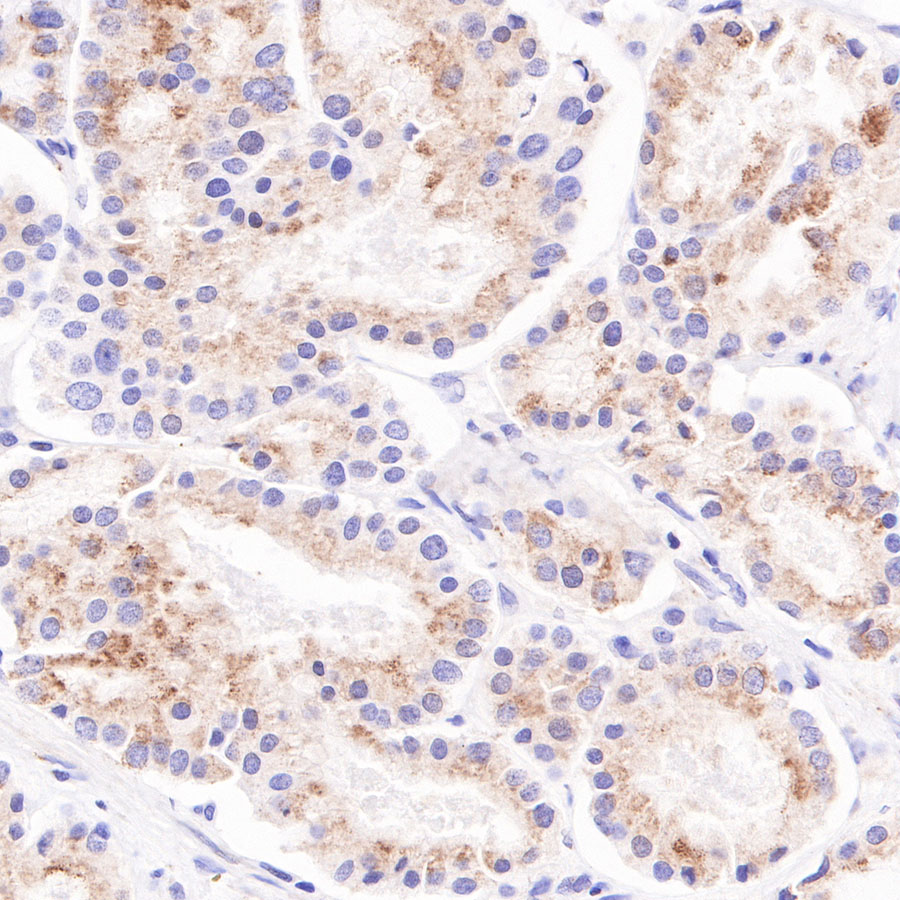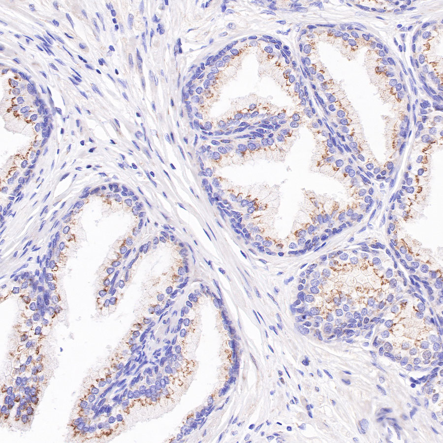 IHC shows positive staining in paraffin-embedded human prostate. Anti-AMACR antibody was used at 1/1000 dilution, followed by a HRP Polymer for Mouse & Rabbit IgG (ready to use). Counterstained with hematoxylin. Heat mediated antigen retrieval with Tris/EDTA buffer pH9.0 was performed before commencing with IHC staining protocol.