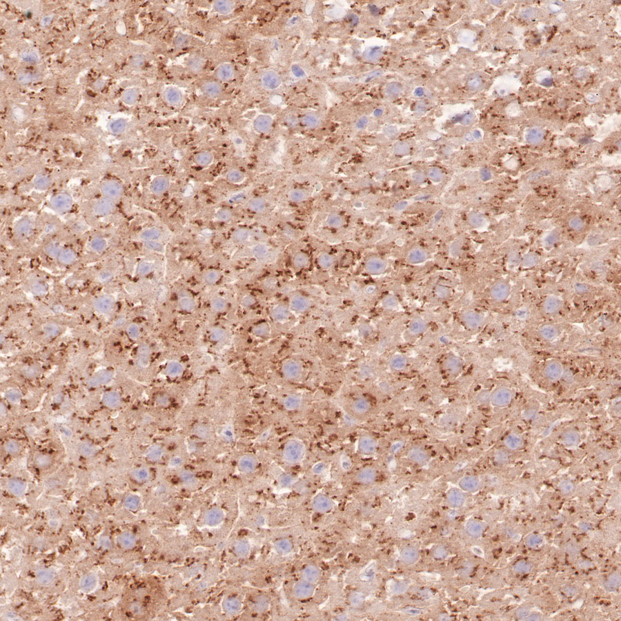 IHC shows positive staining in paraffin-embedded mouse liver. Anti-AMACR antibody was used at 1/1000 dilution, followed by a HRP Polymer for Mouse & Rabbit IgG (ready to use). Counterstained with hematoxylin. Heat mediated antigen retrieval with Tris/EDTA buffer pH9.0 was performed before commencing with IHC staining protocol.