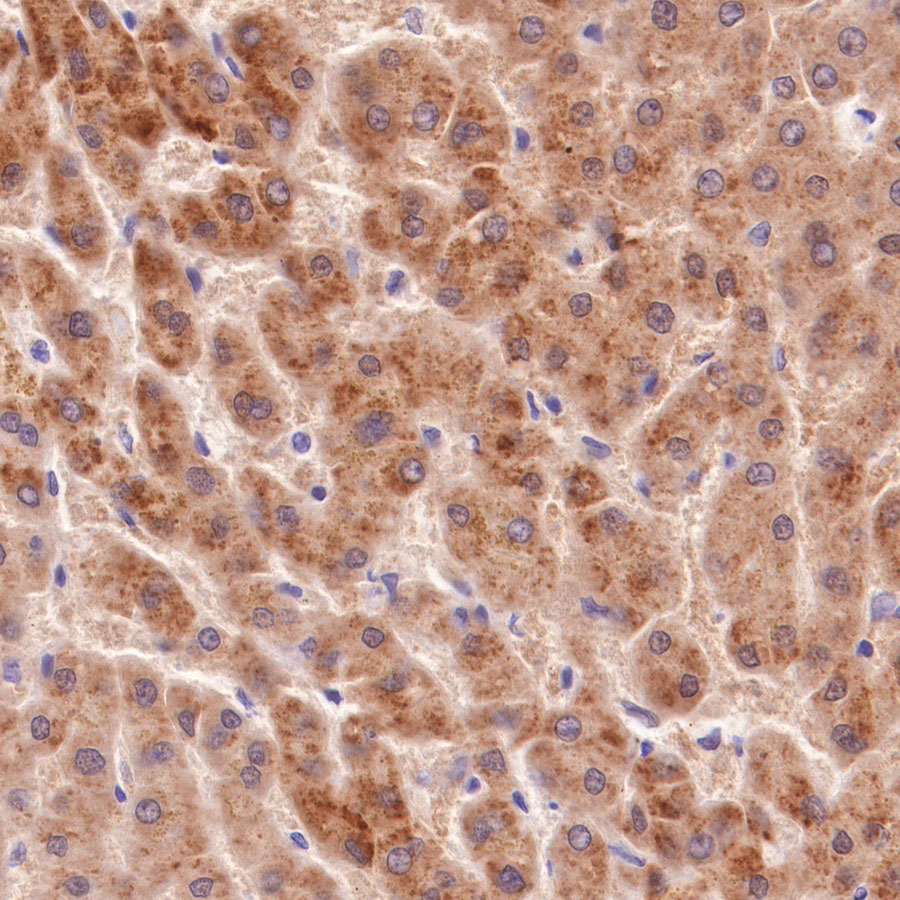 IHC shows positive staining in paraffin-embedded human liver. Anti-AMACR antibody was used at 1/1000 dilution, followed by a HRP Polymer for Mouse & Rabbit IgG (ready to use). Counterstained with hematoxylin. Heat mediated antigen retrieval with Tris/EDTA buffer pH9.0 was performed before commencing with IHC staining protocol.
