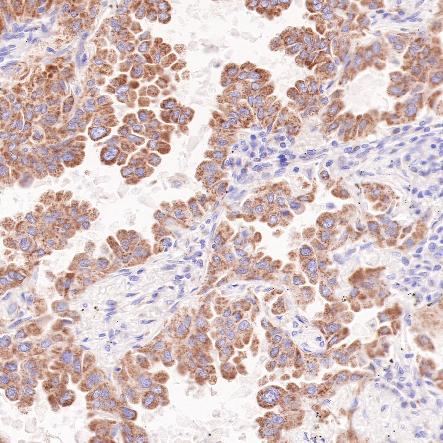 IHC shows positive staining in paraffin-embedded human lung adenocarcinoma. Anti-AMACR antibody was used at 1/1000 dilution, followed by a HRP Polymer for Mouse & Rabbit IgG (ready to use). Counterstained with hematoxylin. Heat mediated antigen retrieval with Tris/EDTA buffer pH9.0 was performed before commencing with IHC staining protocol.
