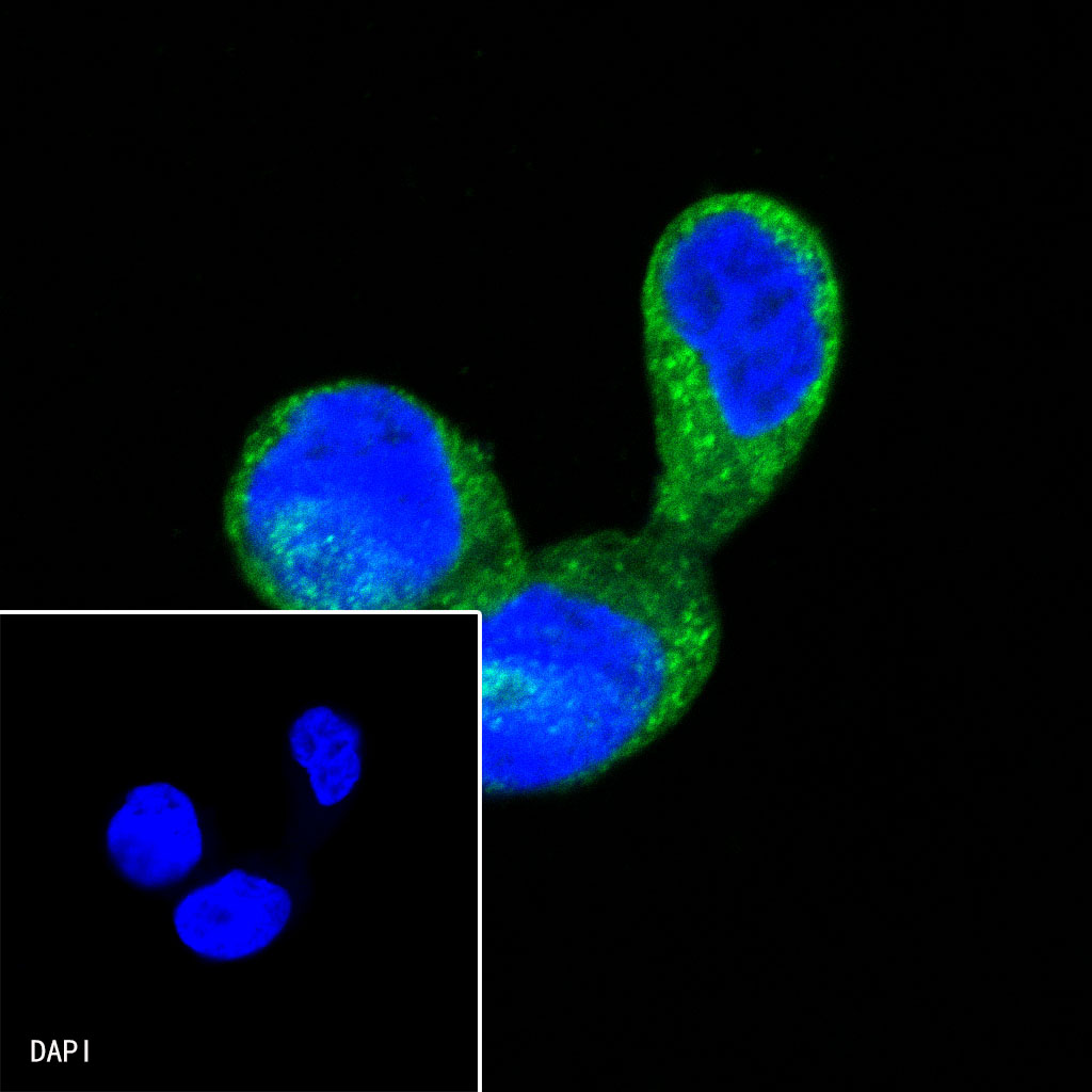 ICC shows positive staining in LNCaP cells. Anti-AMACR antibody was used at 1/250 dilution and incubated overnight at 4°C. Goat polyclonal Antibody to Rabbit IgG - H&L (Alexa Fluor® 488) was used as secondary antibody at 1/1000 dilution. The cells were fixed with 100% ice-cold methanol and permeabilized with 0.1% PBS-Triton X-100. Nuclei were counterstained with DAPI.