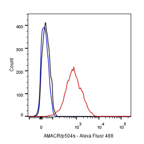 Flow cytometric analysis of LNCaP cells labelling AMACR antibody at 1/250 (0.1 μg) dilution/ (red) compared with a Rabbit monoclonal IgG (Black) isotype control and an unlabelled control (cells without incubation with primary antibody and secondary antibody) (Blue). Goat Anti-Rabbit IgG Alexa Fluor® 488 was used as the secondary antibody.