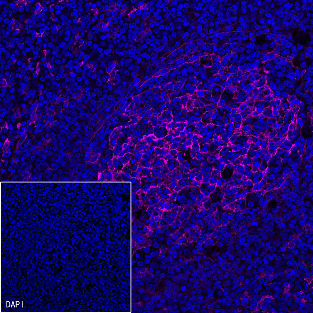 IF shows positive staining in paraffin-embedded human tonsil. Anti-CD14 antibody was used at 1/500 dilution (magenta) and incubated overnight at 4°C. Goat anti-Mouse IgG(H+L) (Alexa Fluor® 647 Conjugate) (S0B4008) was used as secondary antibody at 1/500 dilution. Counterstained with DAPI (Blue). Heat mediated antigen retrieval with EDTA buffer pH9.0 was performed before commencing with IF staining protocol.