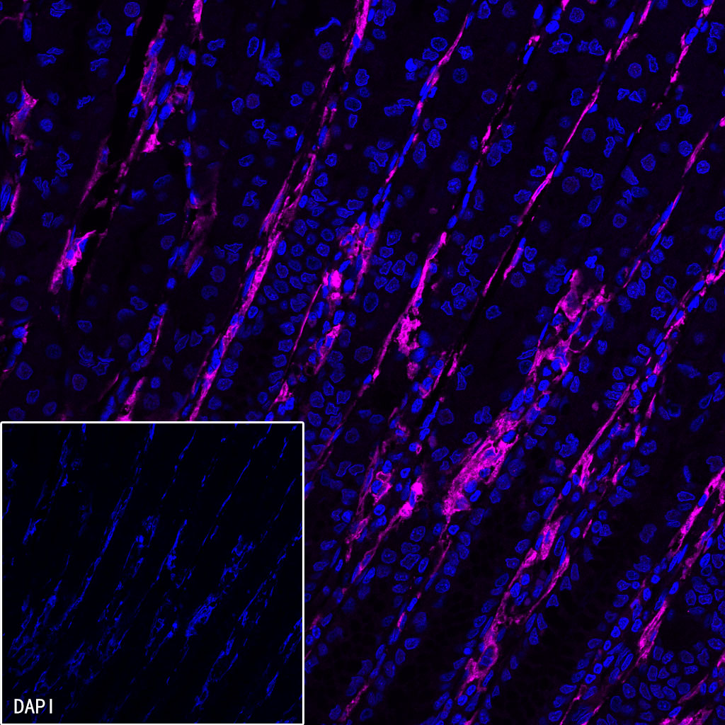 IF shows positive staining in paraffin-embedded human stomach. Anti-CD14 antibody was used at 1/500 dilution (magenta) and incubated overnight at 4°C. Goat anti-Mouse IgG(H+L) (Alexa Fluor® 647 Conjugate)(S0B4008) was used as secondary antibody at 1/500 dilution. Counterstained with DAPI (Blue). Heat mediated antigen retrieval with EDTA buffer pH9.0 was performed before commencing with IF staining protocol.