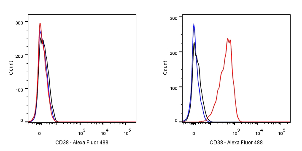 Flow cytometric analysis of HeLa (left) / Ramos (right) cells labelling CD38 (Alexa Fluor 488 Conjugate) antibody at 1/2000 dilution (0.1 μg)/ (red) compared with a Rabbit monoclonal IgG (Black) isotype control and an unlabelled control (cells without incubation with primary antibody and secondary antibody) (Blue). Negative control: HeLa