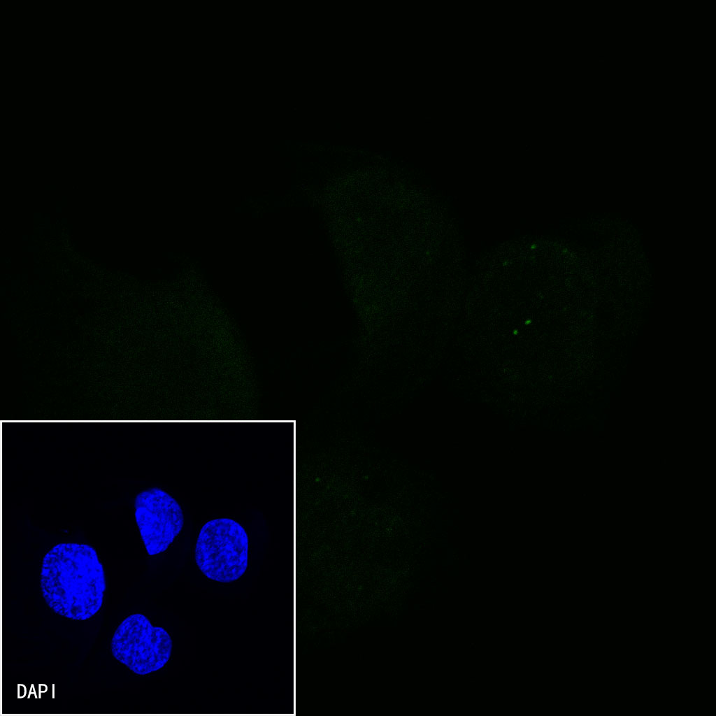 Negative control: ICC shows negative staining in HeLa cells. Anti-CD38 (Alexa Fluor® 488 Conjugate) antibody was used at 1/200 dilution and incubated overnight at 4°C. The cells were fixed with 4% PFA and permeabilized with 0.1% PBS-Triton X-100. Nuclei were counterstained with DAPI (Blue).
