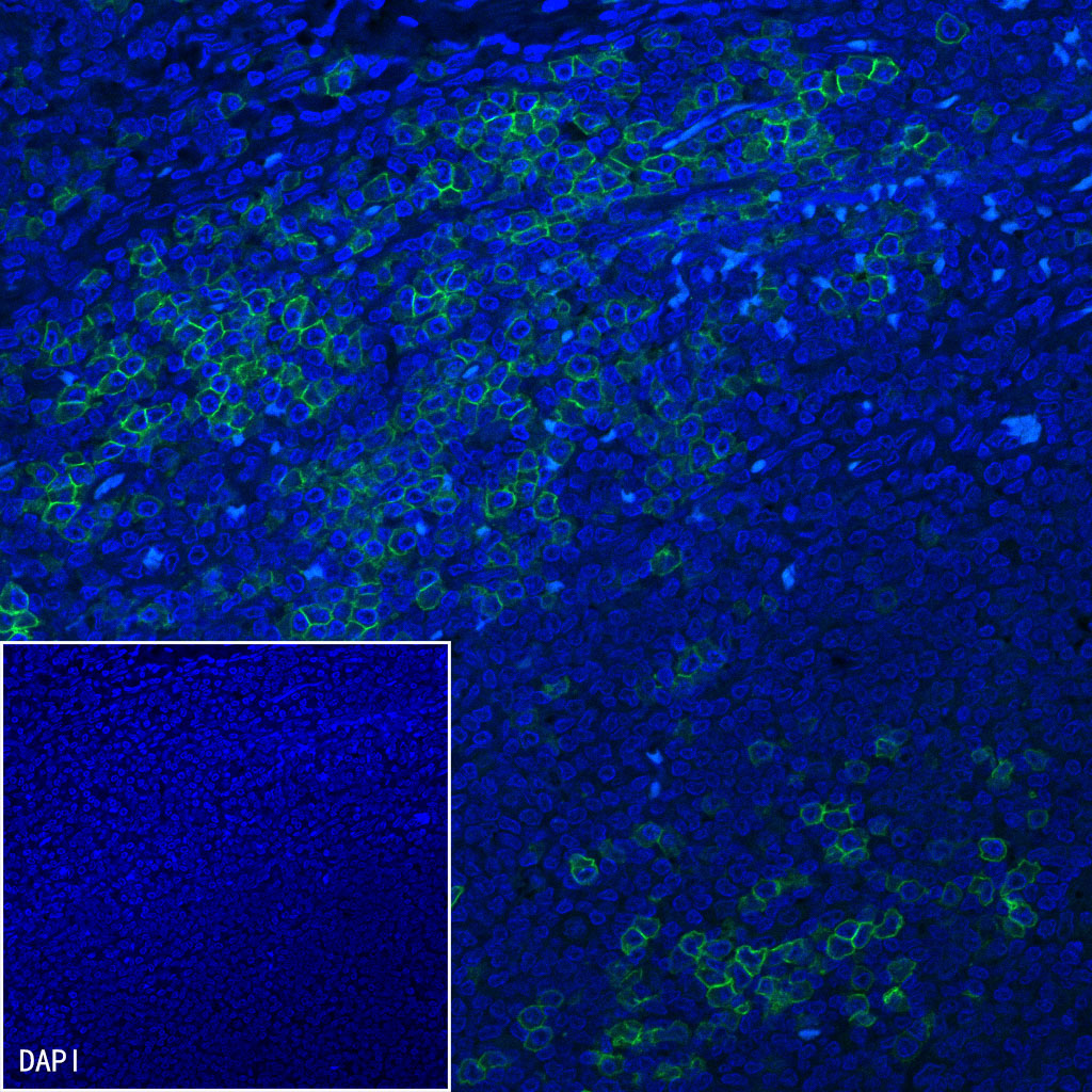 IF shows positive staining in paraffin-embedded human tonsil. Anti-CD38 (Alexa Fluor® 488 Conjugate) antibody was used at 1/200 dilution (green) and incubated overnight at 4°C. Counterstained with DAPI (Blue). Heat mediated antigen retrieval with EDTA buffer pH9.0 was performed before commencing with IF staining protocol.