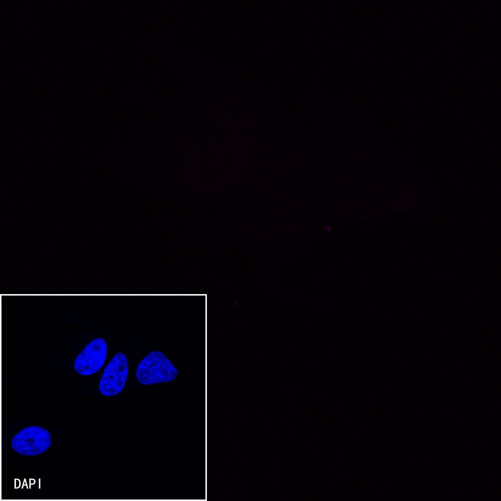 Negative control: ICC shows negative staining in HeLa cells. Anti-CD38 (Alexa Fluor® 647 Conjugate) antibody was used at 1/200 dilution and incubated overnight at 4°C. The cells were fixed with 4% PFA and permeabilized with 0.1% PBS-Triton X-100. Nuclei were counterstained with DAPI (Blue).