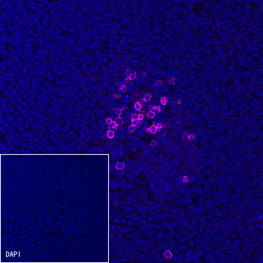 IF shows positive staining in paraffin-embedded human tonsil. Anti-CD38 (Alexa Fluor® 647 Conjugate) antibody was used at 1/200 dilution (magenta) and incubated overnight at 4°C. Counterstained with DAPI (Blue). Heat mediated antigen retrieval with EDTA buffer pH9.0 was performed before commencing with IF staining protocol.