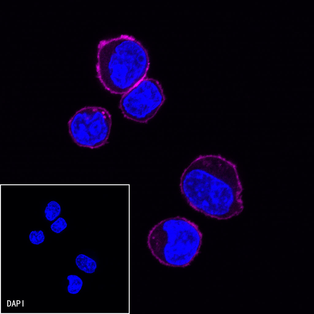 ICC shows positive staining in Ramos cells. Anti-CD38 (Alexa Fluor® 647 Conjugate) antibody was used at 1/200 dilution (magenta) and incubated overnight at 4°C. The cells were fixed with 4% PFA and permeabilized with 0.1% PBS-Triton X-100. Nuclei were counterstained with DAPI (Blue).
