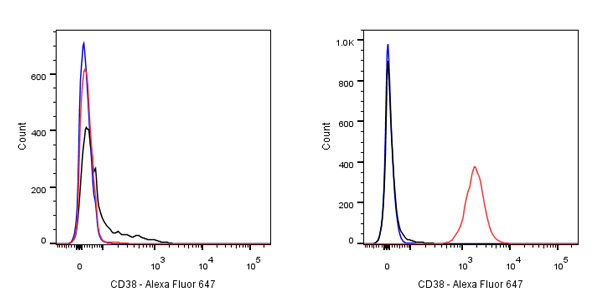 Flow cytometric analysis of HeLa (left) / Ramos (right) cells labelling CD38 (Alexa Fluor 647 Conjugate) antibody at 1/20000 dilution (0.01 μg)/ (red) compared with a Rabbit monoclonal IgG (Black) isotype control and an unlabelled control (cells without incubation with primary antibody and secondary antibody) (Blue).