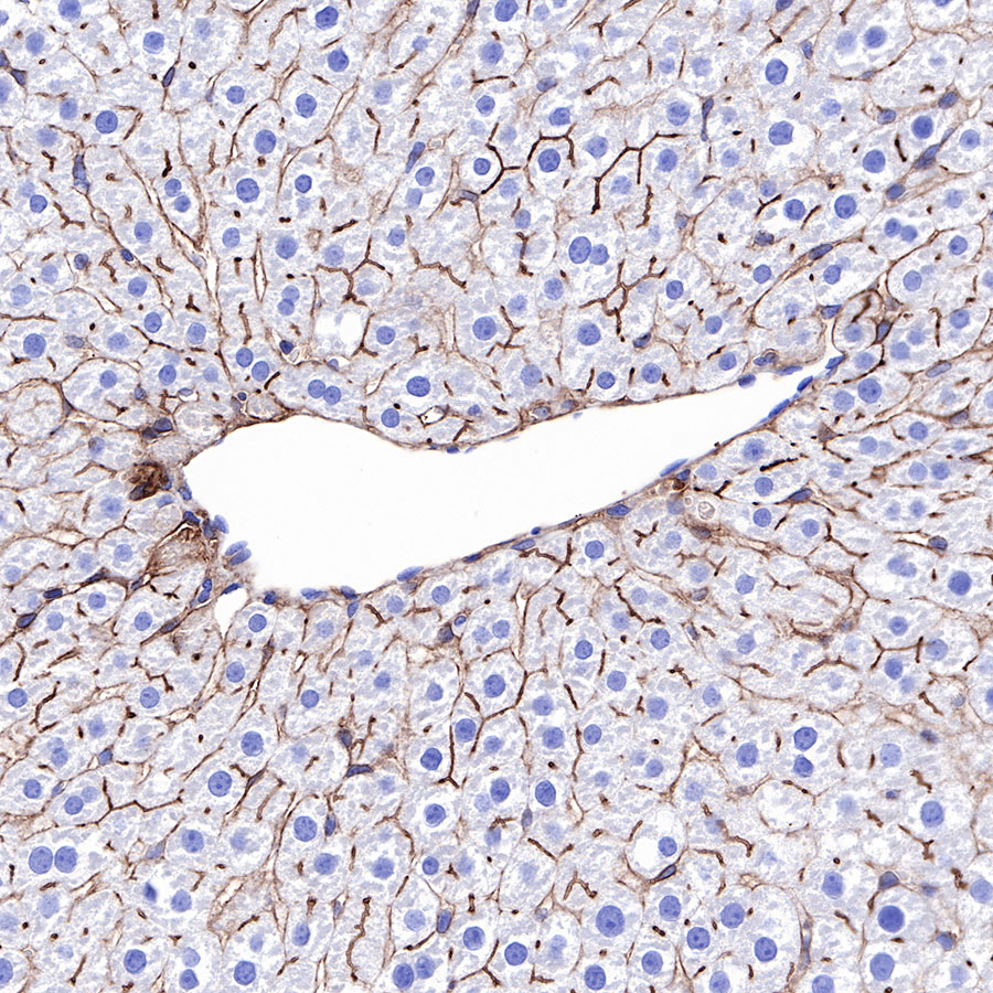 IHC shows positive staining in paraffin-embedded human liver. Anti-CD73 antibody was used at 1/1000 dilution, followed by a HRP Polymer for Mouse & Rabbit IgG (ready to use). Counterstained with hematoxylin. Heat mediated antigen retrieval with Tris/EDTA buffer pH9.0 was performed before commencing with IHC staining protocol.