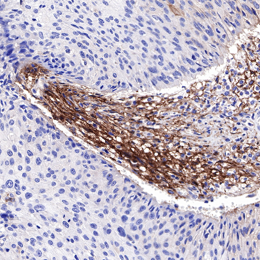 IHC shows positive staining in paraffin-embedded human cervical squamous cell carcinoma. Anti-CD73 antibody was used at 1/500 dilution, followed by a HRP Polymer for Mouse & Rabbit IgG (ready to use). Counterstained with hematoxylin. Heat mediated antigen retrieval with Tris/EDTA buffer pH9.0 was performed before commencing with IHC staining protocol.