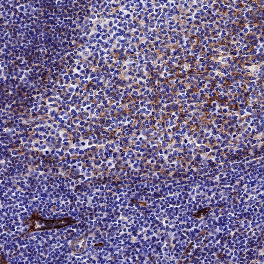 IHC shows positive staining in paraffin-embedded human tonsil. Anti-CD73 antibody was used at 1/500 dilution, followed by a HRP Polymer for Mouse & Rabbit IgG (ready to use). Counterstained with hematoxylin. Heat mediated antigen retrieval with Tris/EDTA buffer pH9.0 was performed before commencing with IHC staining protocol.