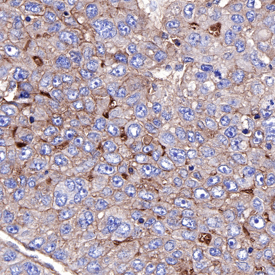 IHC shows positive staining in paraffin-embedded human hepatocellular carcinoma. Anti-CD73 antibody was used at 1/500 dilution, followed by a HRP Polymer for Mouse & Rabbit IgG (ready to use). Counterstained with hematoxylin. Heat mediated antigen retrieval with Tris/EDTA buffer pH9.0 was performed before commencing with IHC staining protocol.