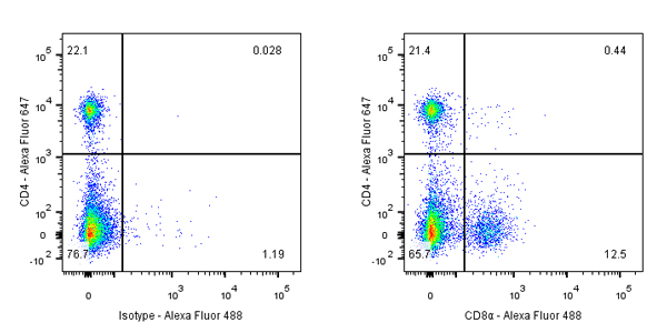 Flow cytometric analysis of mouse primary splenocytes labeling CD8α (Alexa Fluor® 488 Conjugate) antibody at 1/200 (1 μg) dilution / (right panel) compared with a Rabbit IgG, Isotype Control / (left panel). Cells were surface stained with CD4-Alexa Fluor® 647, then stained with Rabbit IgG (Left) / CD8α (Right) separately. CD4 and CD8α are mutually exclusive expressed in mouse primary splenocytes. Gated on total viable cells.