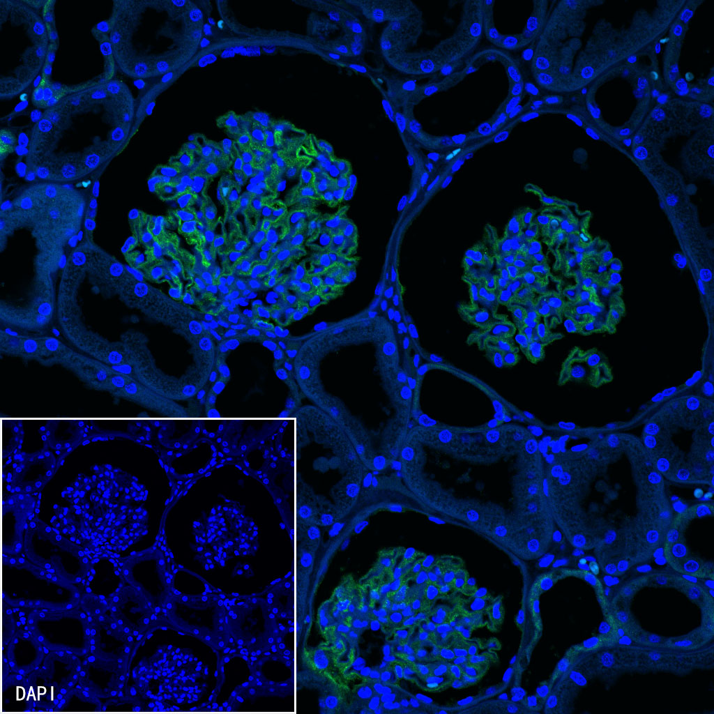 IF shows positive staining in paraffin-embedded human kidney. Anti-Tissue factor antibody was used at 1/200 dilution (Green) and incubated overnight at 4°C. Goat polyclonal Antibody to Rabbit IgG - H&L (Alexa Fluor® 488) was used as secondary antibody at 1/1000 dilution. Counterstained with DAPI (Blue). Heat mediated antigen retrieval with EDTA buffer pH9.0 was performed before commencing with IF staining protocol.