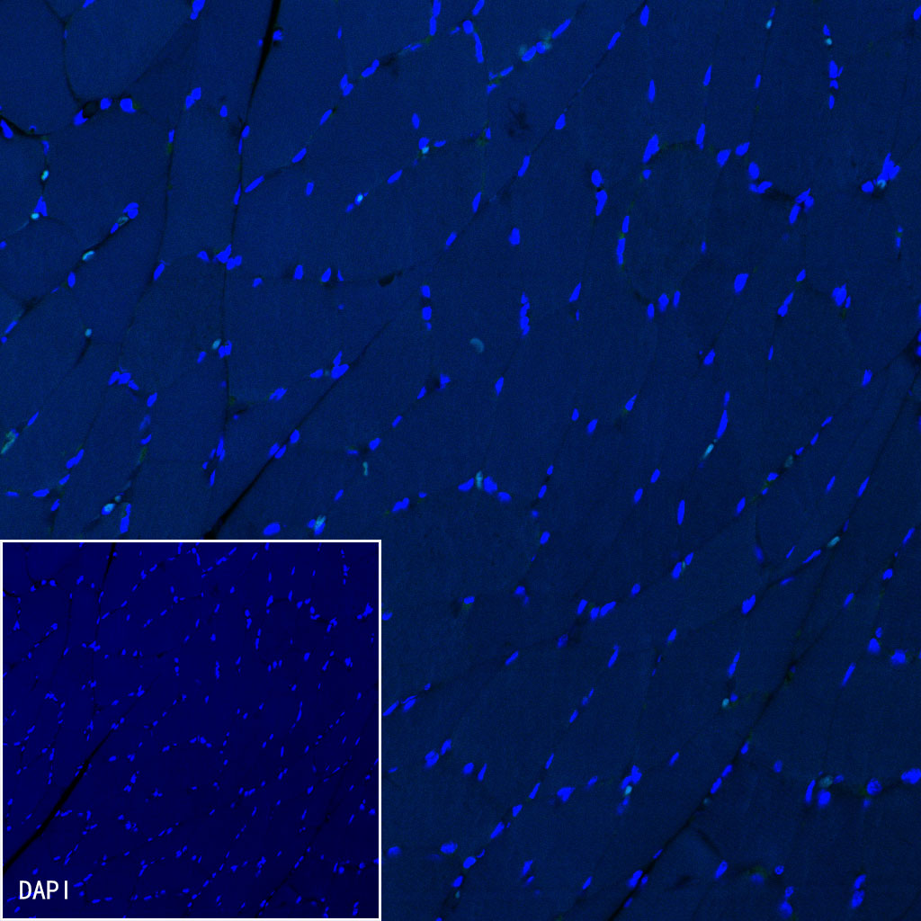 Negative control: IF shows negative staining in paraffin-embedded human skeletal muscle. Anti-Tissue factor antibody was used at 1/200 dilution and incubated overnight at 4°C. Goat polyclonal Antibody to Rabbit IgG - H&L (Alexa Fluor® 488) was used as secondary antibody at 1/1000 dilution. Counterstained with DAPI (Blue). Heat mediated antigen retrieval with EDTA buffer pH9.0 was performed before commencing with IF staining protocol.