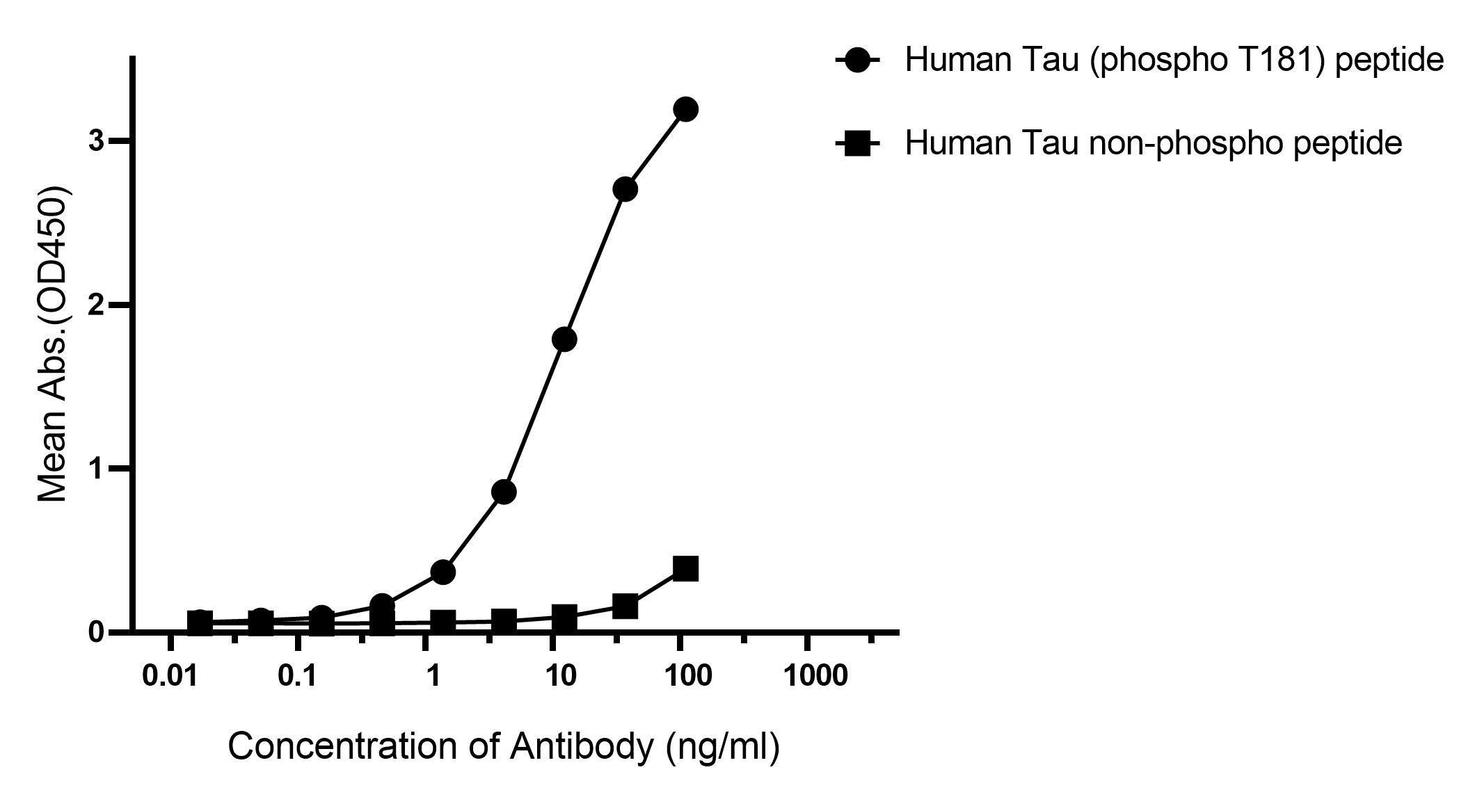 Indirect ELISA antibody dose-response curve using Human Tau non-phospho and Human Tau phospho T181 peptides. Peptide concentration was 500 ng/mL. Tau (phospho T181) Recombinant Rabbit mAb was added at 0-100 ng/mL. Samples were incubated with Peroxidase-AffiniPure Goat Anti-Rabbit IgG (H+L) secondary antibody at 1/10000 dilution.