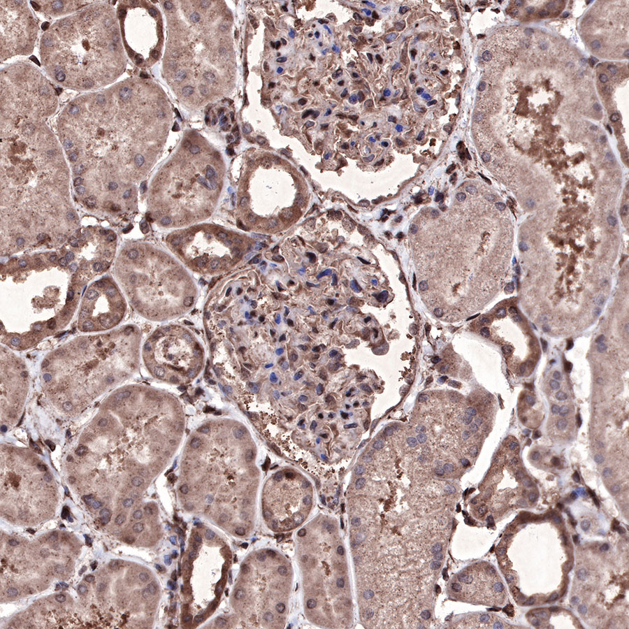 IHC shows positive staining in paraffin-embedded human kidney. Anti-Ubiquitin antibody was used at 1/2000 dilution, followed by a HRP Polymer for Mouse & Rabbit IgG (ready to use). Counterstained with hematoxylin. Heat mediated antigen retrieval with Tris/EDTA buffer pH9.0 was performed before commencing with IHC staining protocol.