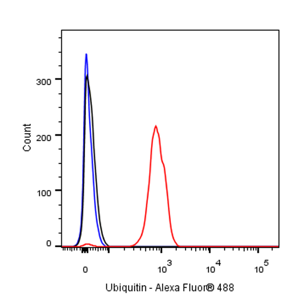 Flow cytometric analysis of 4% PFA fixed 90% methanol permeabilized C6 (Rat glial tumor glial cell) cells labelling Ubiquitin antibody at 1/500 dilution (0.1 μg) / (red) compared with a Rabbit monoclonal IgG (Black) isotype control and an unlabelled control (cells without incubation with primary antibody and secondary antibody) (Blue). Goat Anti - Rabbit IgG Alexa Fluor® 488 was used as the secondary antibody.