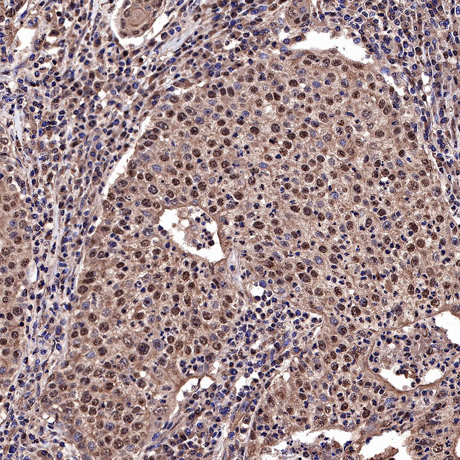 IHC shows positive staining in paraffin-embedded human lung squamous cell carcinoma. Anti-Ubiquitin antibody was used at 1/2000 dilution, followed by a HRP Polymer for Mouse & Rabbit IgG (ready to use). Counterstained with hematoxylin. Heat mediated antigen retrieval with Tris/EDTA buffer pH9.0 was performed before commencing with IHC staining protocol.