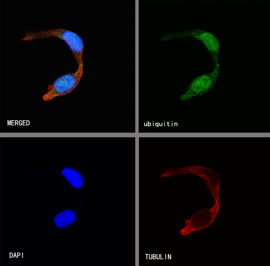 ICC shows positive staining in C6 cells. Anti-Ubiquitin antibody was used at 1/500 dilution (Green) and incubated overnight at 4°C. Goat polyclonal Antibody to Rabbit IgG - H&L (Alexa Fluor® 488) was used as secondary antibody at 1/1000 dilution. The cells were fixed with 100% ice-cold methanol and permeabilized with 0.1% PBS-Triton X-100. Nuclei were counterstained with DAPI (Blue). Counterstain with tubulin (red).